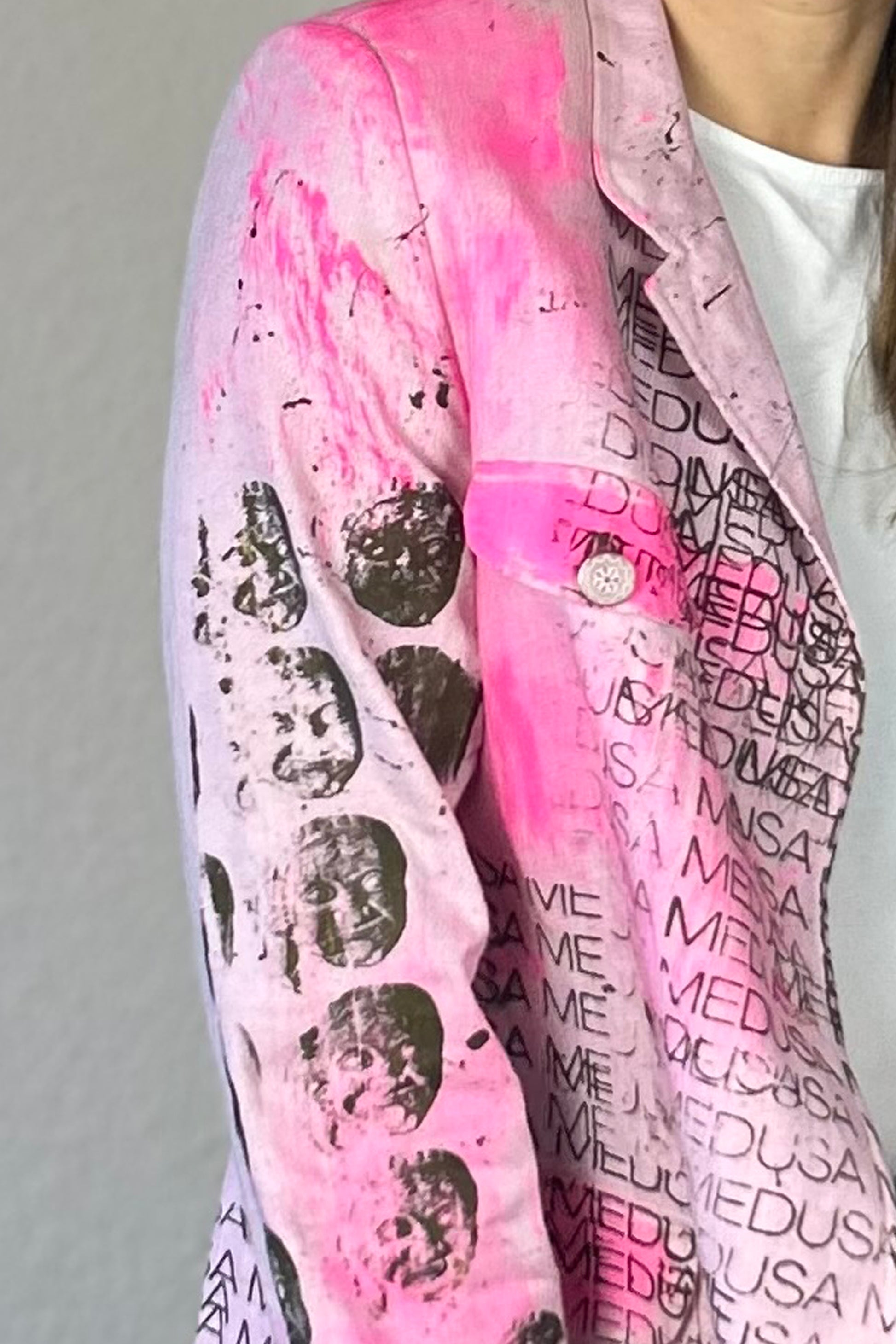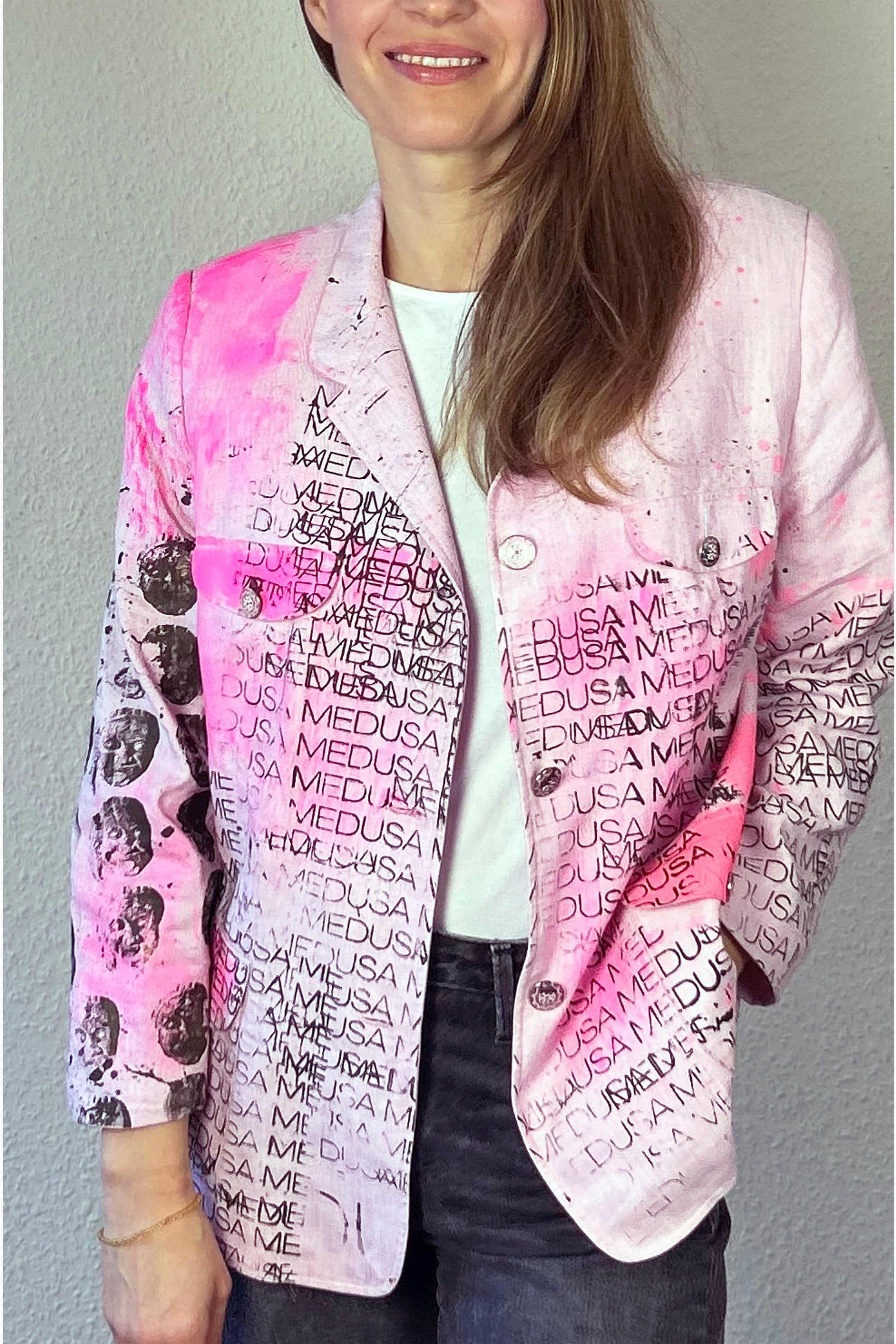 Linen with viscose, feminine pink balanced with a bold black Medusa print.