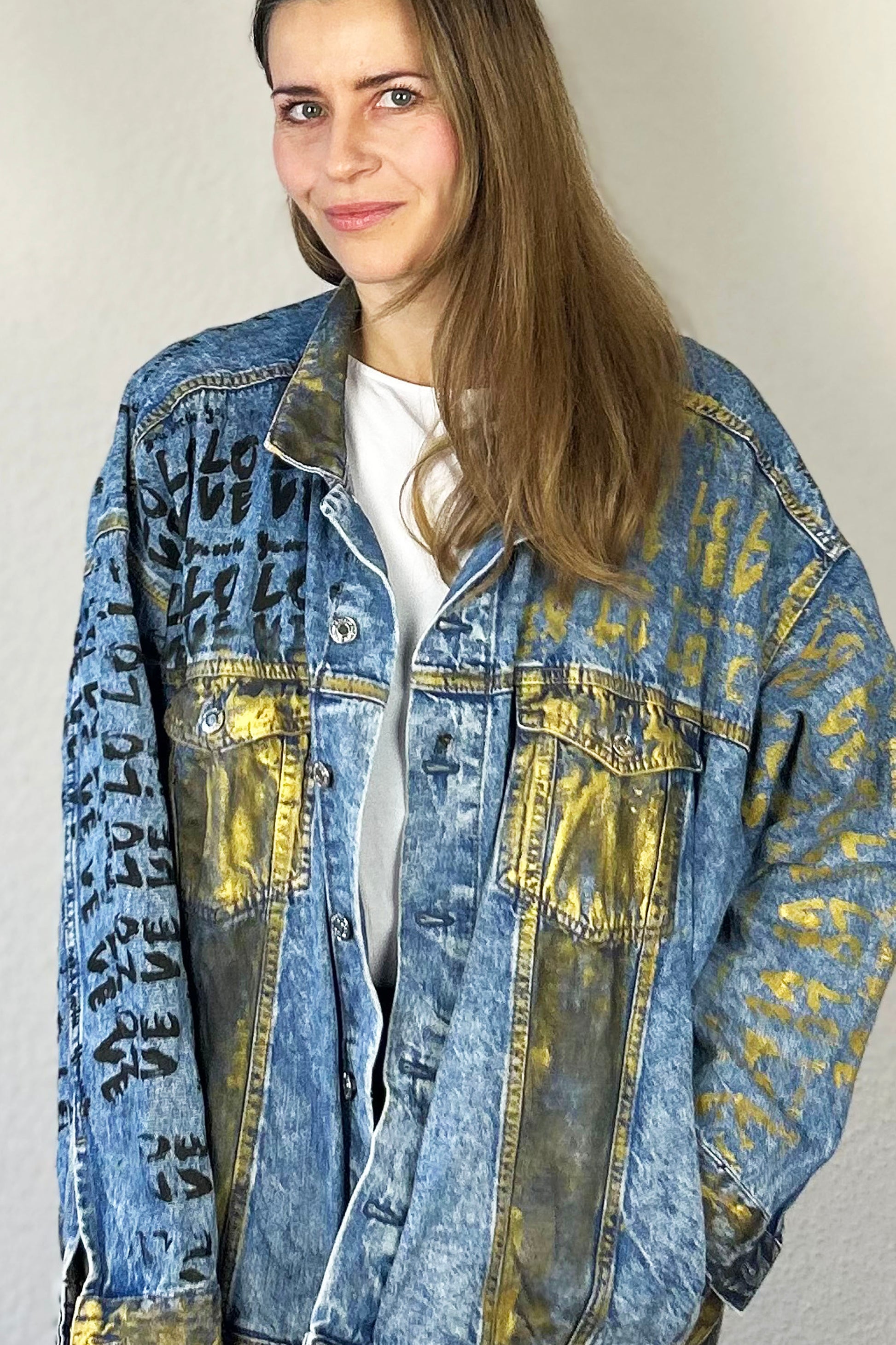 Oversize denim jacket, totally badass, with a gold-black YOU ARE THE LOVE graphic.