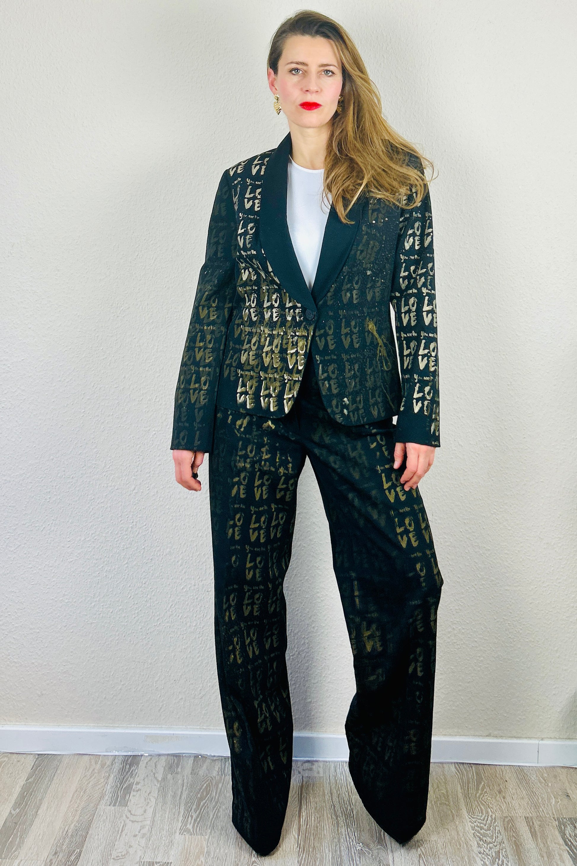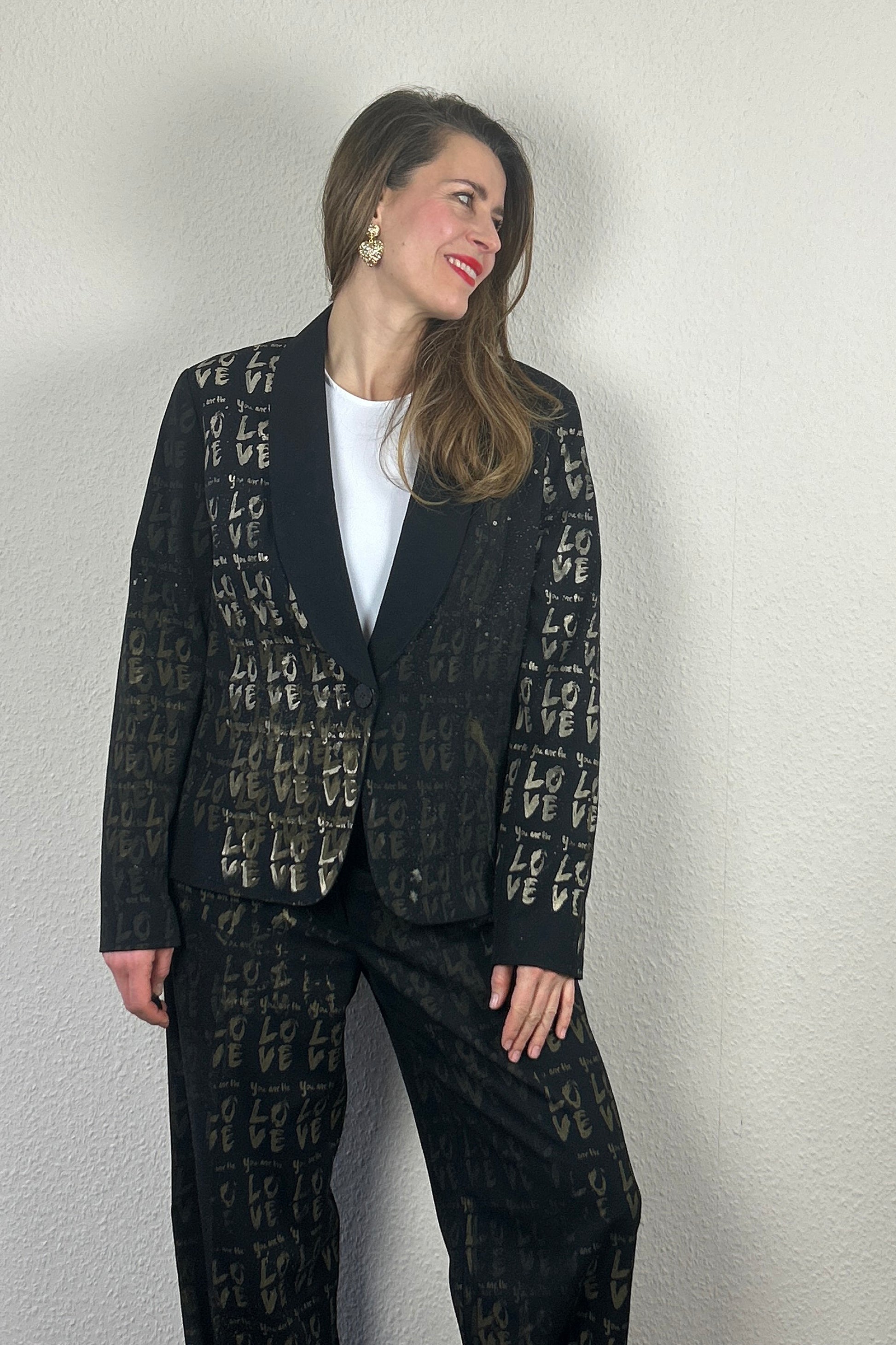 Black suit with the original graphic “You are the love / I’m the love.”